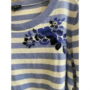 Slip into a cozy Talbots knit sweater, a delightful blend of blue and white stripes with an inviting floral pattern. The 3/4 casual sleeves and crew neck design make it a perfect pick for your casual outings or travel days. Crafted with a soft touch, this pullover is a comfy choice for those who value both style and comfort.