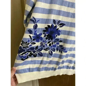 Slip into a cozy Talbots knit sweater, a delightful blend of blue and white stripes with an inviting floral pattern. The 3/4 casual sleeves and crew neck design make it a perfect pick for your casual outings or travel days. Crafted with a soft touch, this pullover is a comfy choice for those who value both style and comfort.
