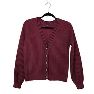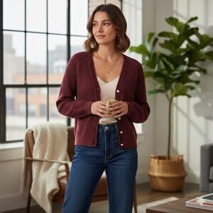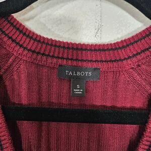 Stay cozy and stylish with this Talbots burgundy cardigan sweater. Size small and in excellent condition. Perfect for layering, this sweater adds a touch of elegance to any outfit. Measures 22" long, sleeves are 22.5" and bust is 18"