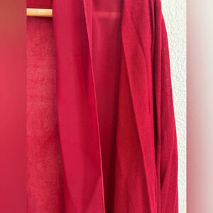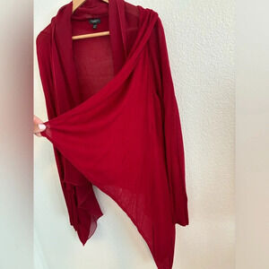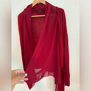 Features: Open front, Draped cardigan, thin soft knit with a layer of shear red fabric drape around front and neck.