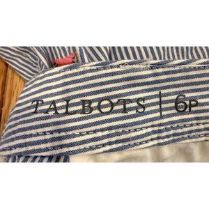 Talbots Chino pants in a regular size feature a blue and white striped pattern with charming watermelon embroidery. Made from 97% cotton, 3% spandex, and 100% polyester, these pants are machine washable for easy care. Manufactured in Jordan, they are suitable for casual outings or relaxed summer gatherings. The pants are pre-owned. Keywords: Talbots, Chino, women's pants, blue, watermelon embroidery, cotton, spandex, polyester, machine washable, summer wear, casual, pre-owned, Jordan, striped.