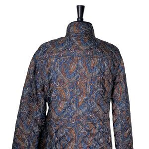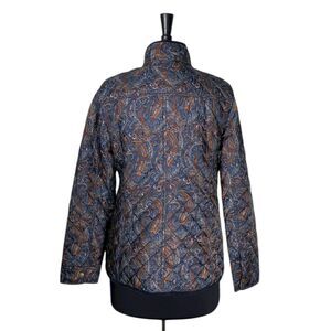 Key Features: Brand: Talbots | Size: Medium | Color: Multicolor | Pattern: Paisley | Material: 100% Polyester shell/lining/fill | Fabric: Quilted corduroy | Neckline: High neck | Closure: Zip + snap buttons | Sleeve: Long sleeves | Cuffs: Snap | Pockets: Two front button pockets | Fit: Classic | Made in Vietnam | Care: Machine washable | Condition: Excellent pre-owned