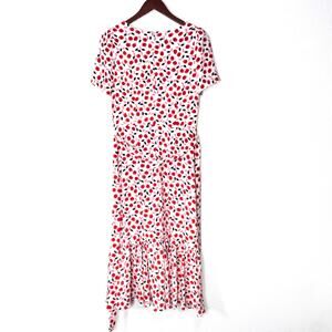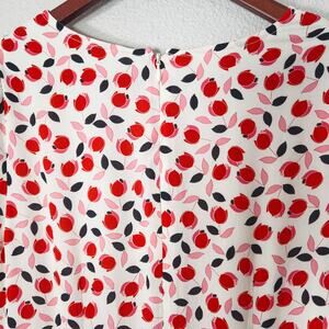 Talbots tulip print midi dress in a soft ivory base with scattered red, pink, and navy florals, finished with a gentle ruffle hem and light ruching at the bust. Women’s size 4. The silhouette skims the body with ease, and the slight stretch gives it movement while keeping the structure feminine and classic. Hidden back zip, fully lined, and easy to care for—machine washable but still polished. The print feels like a garden in bloom without being too sweet.