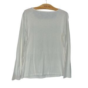 This sophisticated white long sleeve top from Talbots features delicate eyelet embroidery in horizontal stripes across the front, creating a subtle yet elegant texture. The soft, lightweight fabric offers a relaxed drape while maintaining structure for a polished look. With its versatile square neckline and clean, minimalist design on the back, this piece transitions effortlessly from workday to weekend.