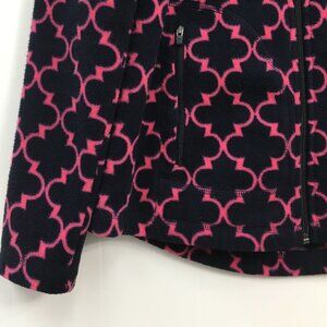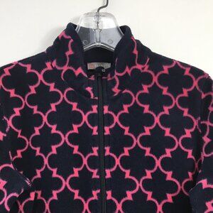 Talbots Women's Full Zipper Fleece Jacket Size S GREAT Condition, pink and dark navy trellis print, mock neck, long sleeve, soft fleece, full front zip, round hem, two side zipper pockets at waist, casual, warm, fall/winter, comfortable