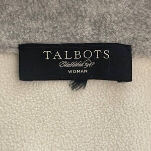 This stylish gray pea coat by Talbots is the perfect addition to any woman's wardrobe. Made from high-quality polyester fleece, this coat is both comfortable and durable. The single-breasted design features a button closure and a collar, adding a touch of sophistication to the classic pea coat style.