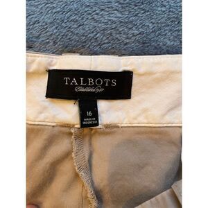 Talbots Chino Plus pants in a khaki beige color, designed for women in a size 16 Plus. Made from a comfortable blend of cotton and spandex, these pants offer a regular fit with a mid-rise waist measuring 18 inches. Ideal for casual summer occasions, they feature a solid pattern and a button closure. Manufactured in Indonesia, these chinos are machine washable for easy care. Pre-owned condition.