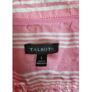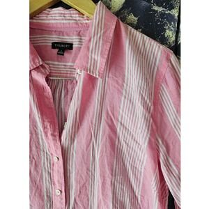 A stylish and comfortable Talbots button-down shirt for women. This classic piece features a pink and white striped pattern that adds a touch of preppy charm.