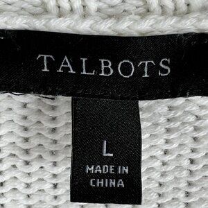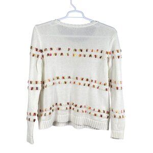 white knit sweater multicolor sweater cotton knit sweater Talbots sweater crew neck sweater casual wear sweater long sleeve knit cozy sweater ribbed hem sweater soft knit sweater winter wardrobe women's sweater large colorful detail sweater
