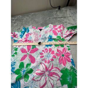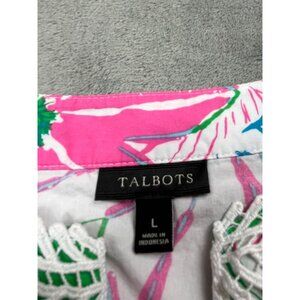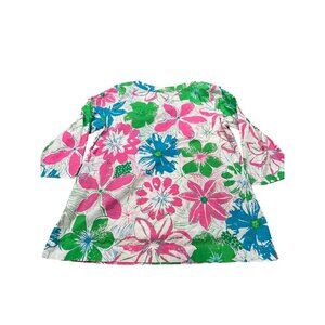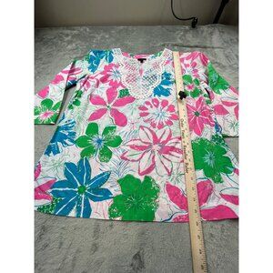 Crafted by Talbots, this tunic features a vibrant floral print in pink, green, and blue. Made from 100% cotton, the top offers comfort and style with its embroidered neckline and 3/4 sleeves. Suitable for casual or semi-casual settings, it's a colorful addition to any wardrobe.