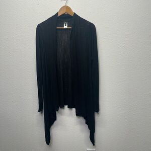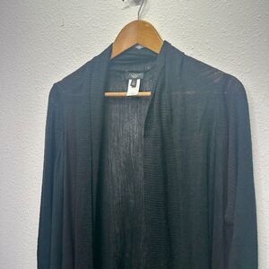 Keywords: coatigan, black coatigan, women's jacket, long sleeve, open front, casual wear, formal wear, lightweight fabric, fall fashion, spring fashion, winter fashion, machine washable, solid black, versatile jacket, pre-owned.