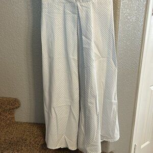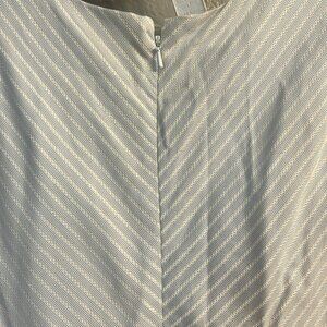 Women’s 90’s Sky Blue and white diagonal pattern bands; sleeveless dress. The front Surplice bodice forms a deep V attaching into the waist seam line with the skirt having an inverted pleat giving additional fullness. Dress is fully lined with a white fabric and has a zipper closure. Comes with a matching belt. Condition: Preowned; Good (belt needs cleaning) Pit to pit: 18” Waist: 16” Length from shoulders: 50” Weight: 13 oz Measurements are taken while flat and are approximate and ships from a smoke free home. #A005