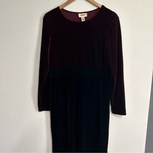 This is a pretty and colorful color block velvet maxi dress. Red green and black in color.