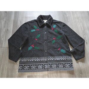Talbots Womens Medium Wool Christmas Cardigan Embroidered Holly & Nordic Pattern