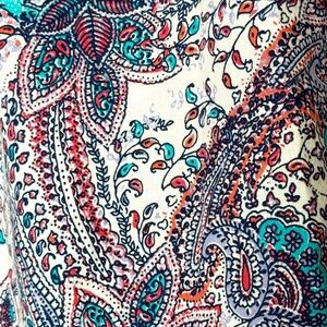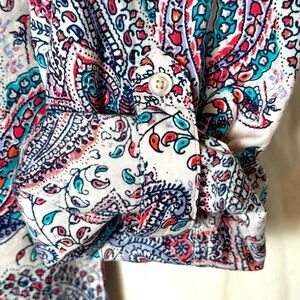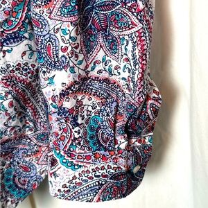 Bright and cheery, this colorful paisley blouse will satisfy your inner hippie! Sz L and roll tab sleeves, this top is perfect for all 4 seasons.