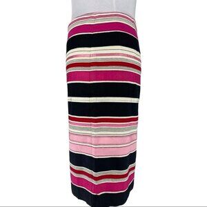 Talbots women's size 4 petite skirt. it has a textured ribbon pink, black and white striped pattern, lined, straight cut, above the knee length, back slit, with hook and zip closure. Materials shell 97% cotton, 3% spandex, lining 100% polyester. Dry clean only. CA#23147 MFSR: $109.00 Condition is new with tags with one pin size stain on front as shown in pictures. Please preview the measurements to ensure fit.