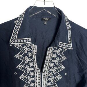 Chic and versatile Talbots embroidered tunic blouse in navy with white embroidery detail.