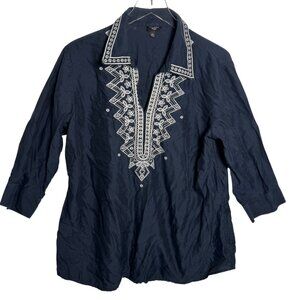 Talbots Women’s Navy Blue White Embroidered Tunic Top Size 18 W 18W 3/4 Sleeve