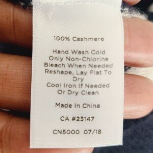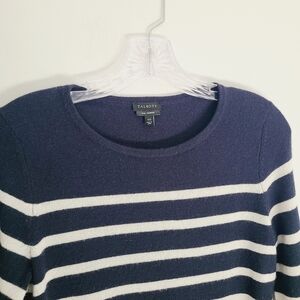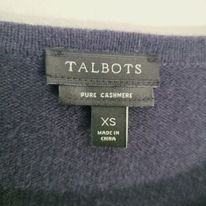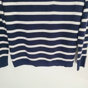 Women's navy blue and white striped 100% cashmere sweater by Talbots, size XS. Crewneck. Ribbing on wrists and small buttons on the outside of sleeves/wrists. Lightweight cashmere sweater is in excellent pre-owned condition overall; slight sweat on back sleeve (see pic 8).