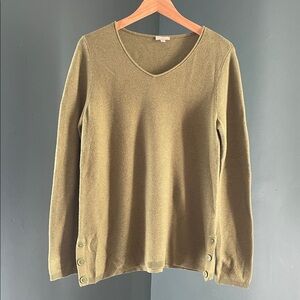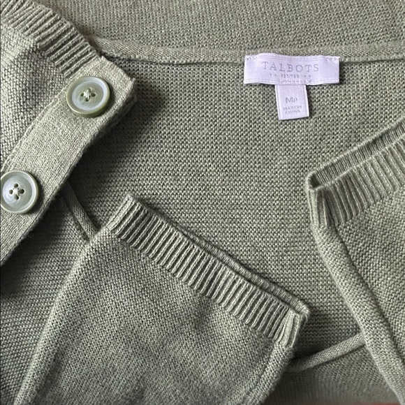 Chic olive cardigan from Talbots. Features button details and ribbed cuffs. Ideal for layering.