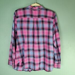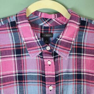 Talbots Women's Pink Metallic Blue Plaid Button Up Long Sleeve Shirt Size Large