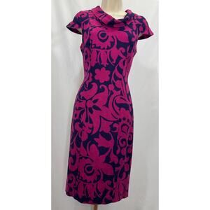 Stunning Talbots sheath dress. Featuring a vibrant pink and navy floral print, this dress is perfect for both workwear and special occasions. The design showcases a flattering cowl neckline, which adds a soft, draped elegance, paired with cap sleeves for a sophisticated silhouette. Fully lined with a side zip closure, it ensures both comfort and style.