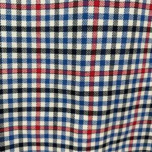 Colors: White background with red, blue and black criss cross plaid pattern