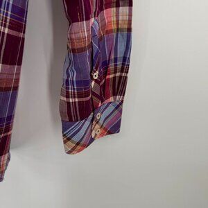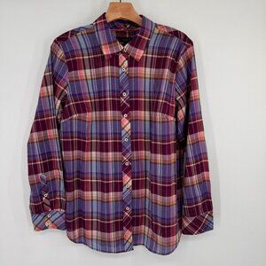 Talbots Womens Plaid Shirt size Large Long Sleeve Cotton Metallic Blend