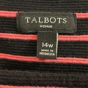 This Talbots dress is a size 14W plus, featuring an A-line fit and flare style. It is knee-length with a multicolor stripe pattern, designed for casual occasions. The dress has a square neckline and short sleeves, suitable for spring. Made from a blend of cotton, polyester, and spandex, it is machine washable. Manufactured in Indonesia, this dress is in excellent pre-owned condition. Keywords: Talbots, plus size, A-line dress, fit and flare, knee-length, multicolor, stripe, casual dress, spring fashion, square neck, short sleeve, cotton blend, machine washable, women's clothing, Indonesia.