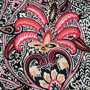 Make a statement in this pretty and polished paisley shift. Details include a flattering square neckline, bold trim, and three-quarter sleeves.