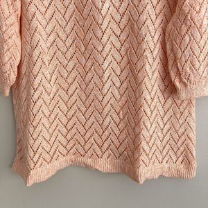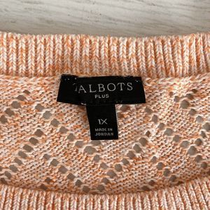 Talbots Womens Plus Open Knit 3/4 Sleeve Sweater Peach Size 1X Cotton Linen. Talbots women's plus size sweater. Open / crochet knit. 3/4 sleeves. Round neck. Cotton and linen fabric. Peach / light orange color. Size 1X. Measured laying flat: measures 21.5" from armpit to armpit. Measures 24.5" from mid tag to end of sleeve. Measures 26" long from top of tag to hem of sweater.