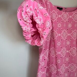 Talbots Puff Sleeve Embroidered Eyelet Dress Pink Round Neck Knee Length Lined Scalloped Hem Elastic Puff Sleeves Back Zip Feminine Dainty Cottage Fairy Spring Closure