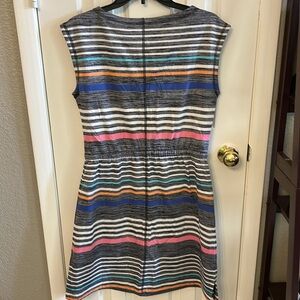 Talbots Women’s (S) Multi Color Striped Shift Dress Sleeveless Summer Vacation NWT Dress. Vibrant stripes add dimension, while the drawstring waist provides a shapely fit when cinched. Notched neckline, sleeveless, kangaroo pockets. Cotton, Polyester, Spandex.