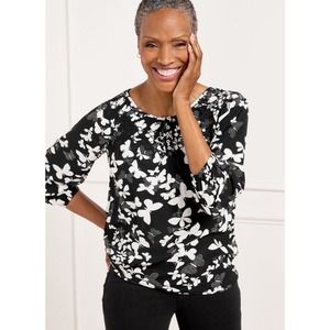 Elevate your wardrobe with this charming Talbots blouse, featuring a multicolor butterfly print and a classic fit. The 3/4 sleeve blouse boasts a scoop neck and fitted sleeves, with a flowy accent that adds a touch of elegance. The breathable material makes it perfect for all seasons, and it comes in a petite size small.