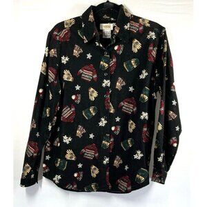 Talbots Women's Shirt Top S Fine Corduroy Winter Print Black Cotton Button Up