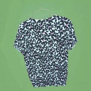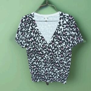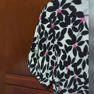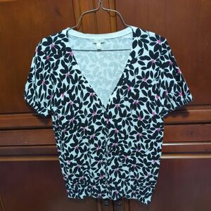 Elevate your wardrobe with this stylish Talbots sweater. Featuring a beautiful floral pattern in my lack/white with bit of pink, this lightweight knit sweater is perfect for any occasion - whether you're traveling, going to a party, or just dressing casually. The short sleeves make it perfect for cool days, while the V-neckline and button front add a touch of elegance. White pearl like buttons.