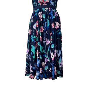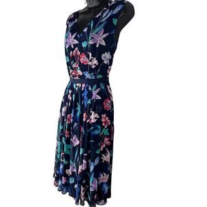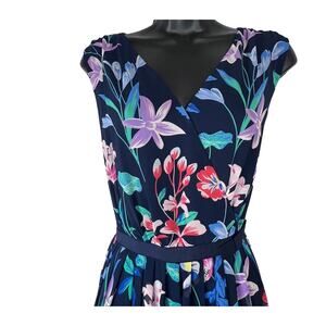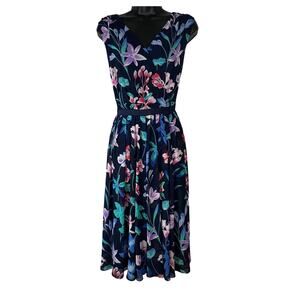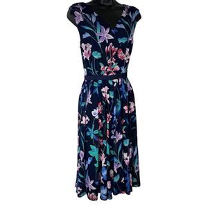 Talbots Women's Size 6 Navy Blue Floral Midi Cocktail Dress Short Sleeve Belted