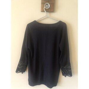 This is a women's blue lightweight sweater/top with 3/4 sleeves that have a floral crochet trim on the cuffs from Talbots, size Medium. This sweater is in very good condition.Cotton/Rayon Blend