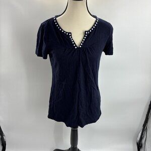 Talbots Womens Size P Petite Top Navy Blue Short Sleeve Emboidered Neckline