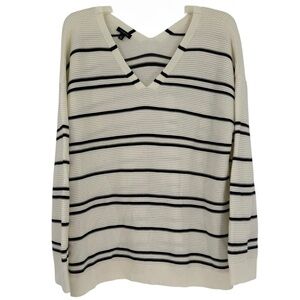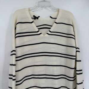 Talbots Women’s Size XL Cream Black Stripe Pullover Long Sleeve Tunic Sweater. Cotton lyocell. Vneck front and back. Long sleeves. Textured horizontal stripes and black stripes. Bust 48. Length 28. Measurements are approximate. Tunic style. Very good preowned condition.