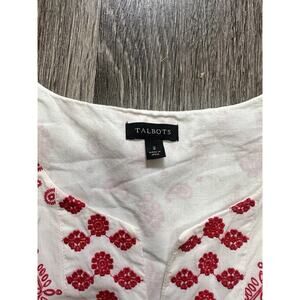 The Talbots Women's Sleeveless Dress in red and white, size 2, is a stylish and versatile piece perfect for both party occasions and casual wear. Made from comfortable cotton material, this knee-length dress features a zip closure and a classic A-line silhouette. The vibrant red color adds a pop of summer fun and the sleeveless design is ideal for warm spring days. Perfect for the fashion-forward woman who wants to make a statement without being over-the-top.