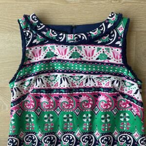 Beautiful Talbots sheath dress featuring a vibrant multicolor geometric and floral pattern. Designed with a classic sleeveless silhouette and subtle fringe trim detail along the neckline and armholes. Perfect for work, brunch, or any occasion where you want to add a pop of color!