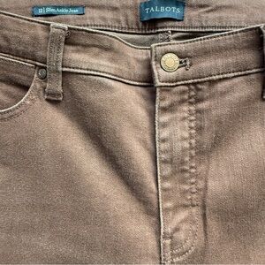 Keywords: Talbots, ankle jeans, slim fit, medium wash, brown jeans, women's fashion, chic style, stretchy fabric, 5-pocket design, casual wear, versatile jeans, comfortable jeans, machine washable, pre-owned jeans.
