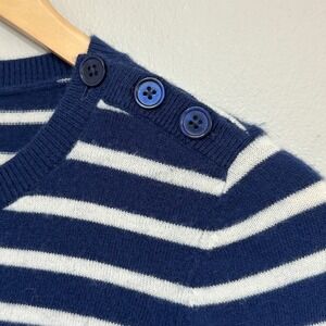 Charming whimsical striped knit sweater featuring a whimsical gold whale applique. This navy blue and white sweater has a classic nautical feel, with a comfortable knit construction that's perfect for layering. The sweater also features three decorative buttons at the left shoulder.