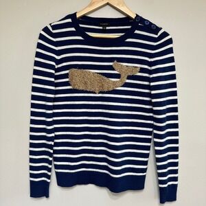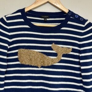 Talbots Womens Striped Knit Sweater XS Gold Whale Applique Navy Blue Nautical
