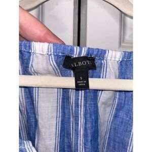 Talbots Women's Blouse, Size S, Regular. Blue striped pattern with a V-neck and 3/4 sleeves. Made from linen with a relaxed fit. Machine washable. Manufactured in India. Pre-owned condition.