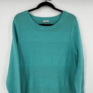 Talbots Womens Sweater 1X Teal Blue Textured Knit Crew Neck Button Sleeve Cotton