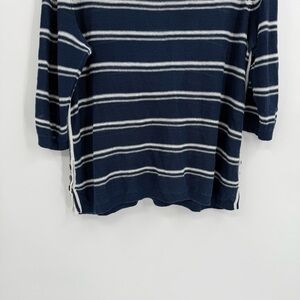 Talbots Women’s Sweater Linen Size 1X Blue Stripe Pullover Long Sleeve Tunic. 3/4 sleeves. Button side detail. Boat neck. Bust 48. Length 27. Measurements are approximate. Tunic style. Lightweight. Very good preowned condition.