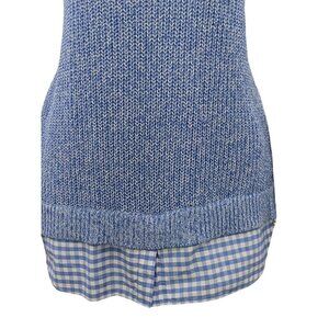 Blue long sleeve Crew neck sweater with faux gingham undershirt shirt accents on the bottom and sleeves.