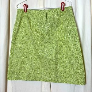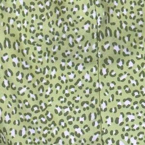 Super cute and perfect for Spring/Summer weather. Pretty green background with a leopard style gray and white print, front zipper with clips. Above the knee skirt.